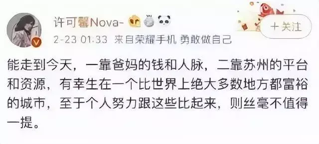 许可馨就是这类人的典范。她称自己是借着父母的背景和金钱,还有就是自己生长的地方给自己带来的资源才能外出镀金。还声称个人的努力在她眼里根本不值一提,因为无论别人怎么努力,只要没有靠着这些资源就不可能超越自己,也更不可能超越阶级。