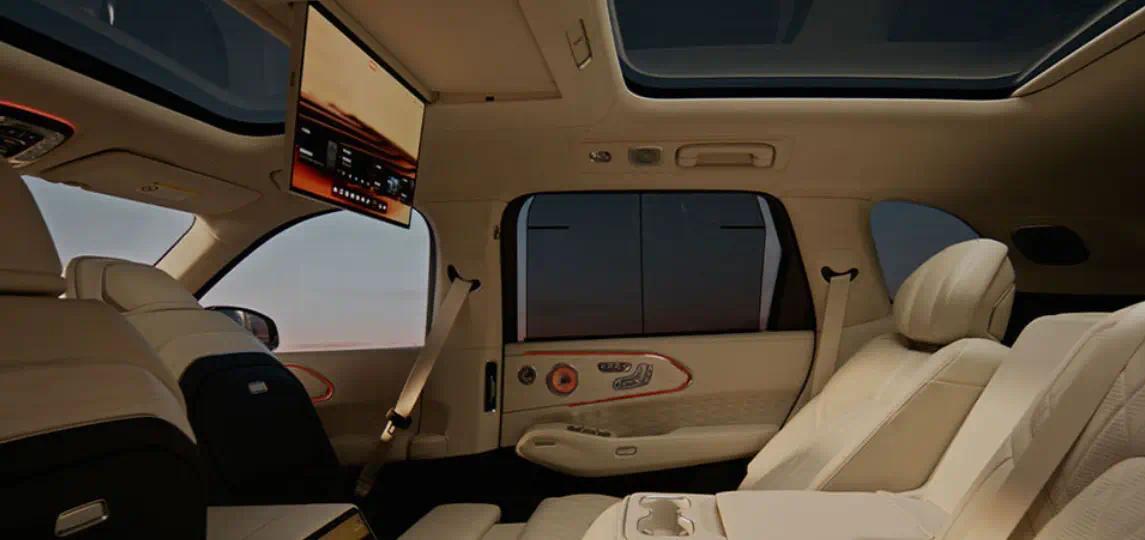 内饰的舒适性做的非常好,座椅按摩、加热和通风这些基操都有,后排也配备了吸顶屏,但是在车里看电视我个人还是觉得不理解,是不晕车还是窗外的风景太差?