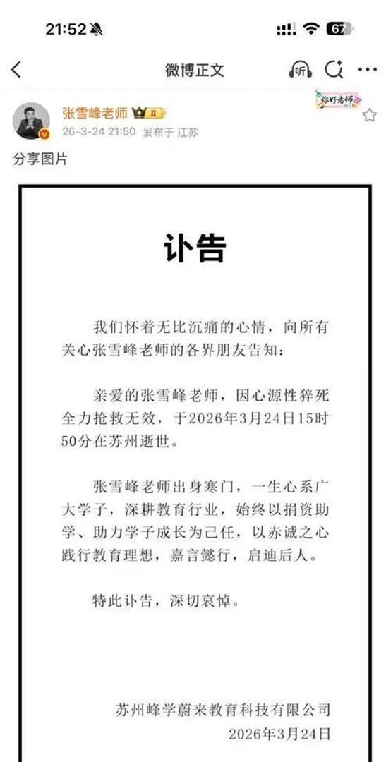 心源性猝死,42岁,前一天还在直播,中午还在公司跑步。 峰学蔚来连夜发了讣告,全网都在刷屏这个东北男人的突然离世。