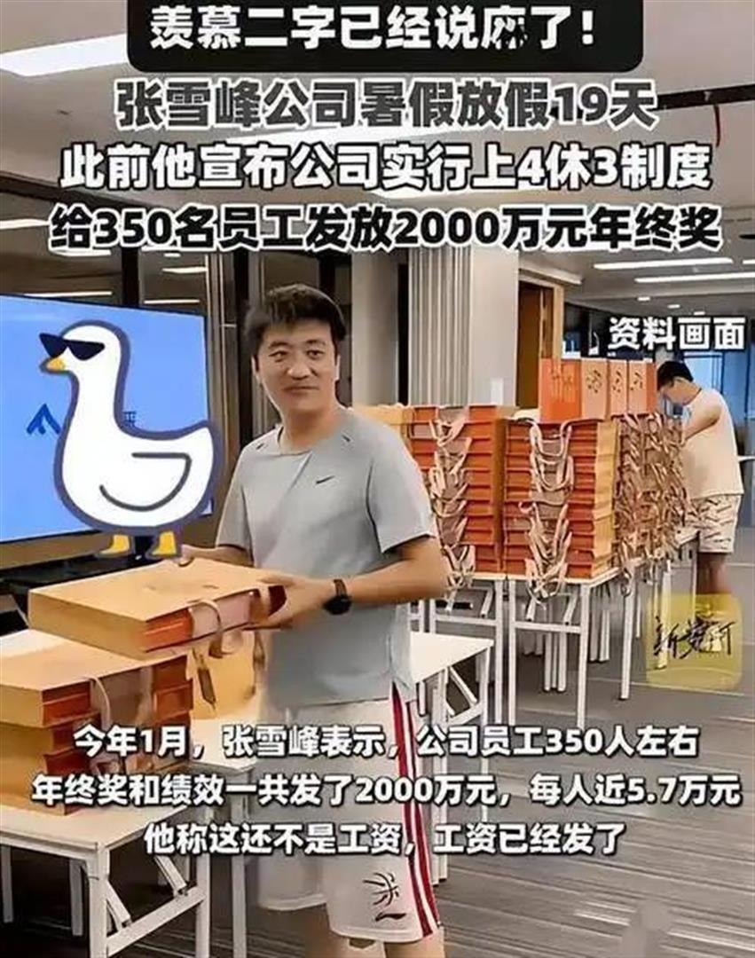 2025年公司年终奖加绩效发了2000万,200多人人均近6万。 上三休四、带薪寒暑假、春节放24天假,入职满两年还能申请无息购房借款。 有员工回忆,家里遇到困难时,张雪峰不仅提前预支工资,还自己掏钱补贴,“他说员工背后是一个个家庭,得对大家负责”。